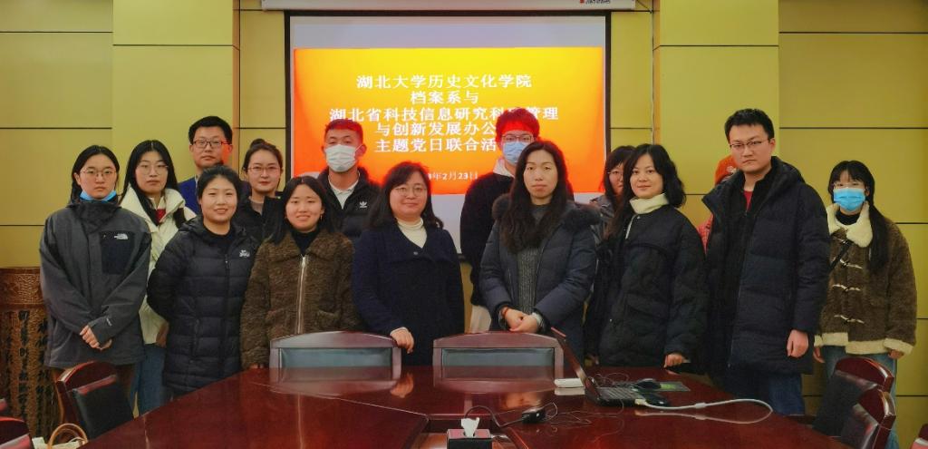 为坚定师生党员的理想信念,进一步加强党支部建设,开展内容丰富、形式多样的支部主题党日活动。2023年2月23日,我院档案系教工党支部与研究生第三党支部联合湖北省科技信息研究院科研管理与创新发展办公室开展主题党日活动,由档案系教工党支部书记赵雪芹教授带队,2021级档案学硕士研究生参加了此次活动,活动在湖北省科技信息研究院展开。