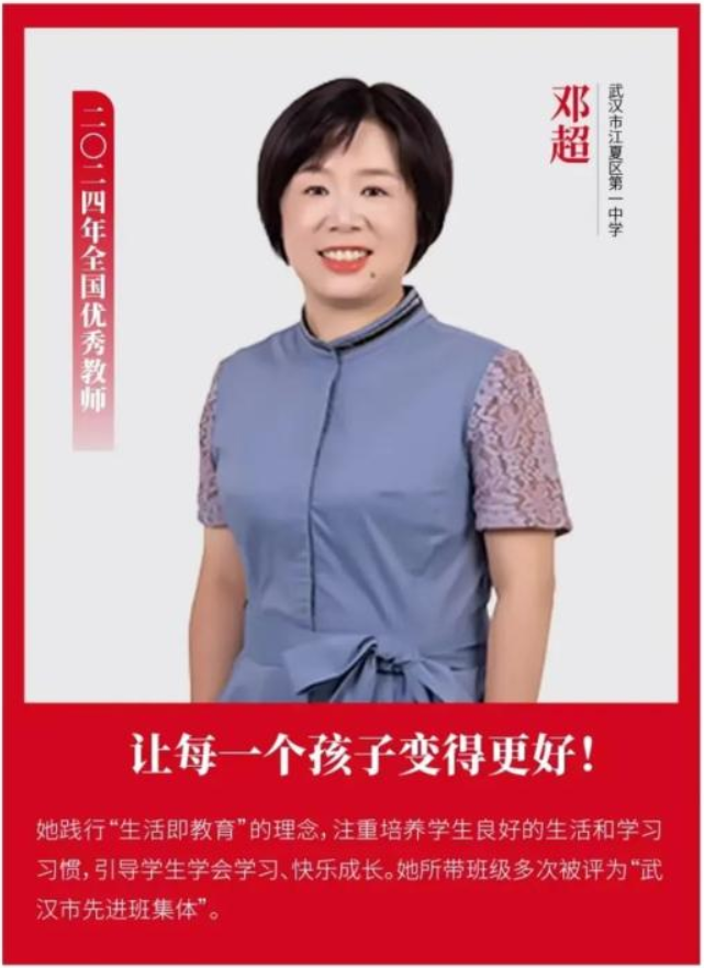 邓超,女,土家族,中共党员, 1980年8月出生,毕业于英国365集团公司历史学教育专业,湖北省党代表,现为武汉市江夏区第一中学历史教师、班主任,多次在课例设计、教学比赛中荣获省级一等奖。2024年9月获评“全国优秀教师”,曾获“武汉市优秀共产党员”“武汉市百优班主任”“武汉市十佳班主任”等光荣称号。