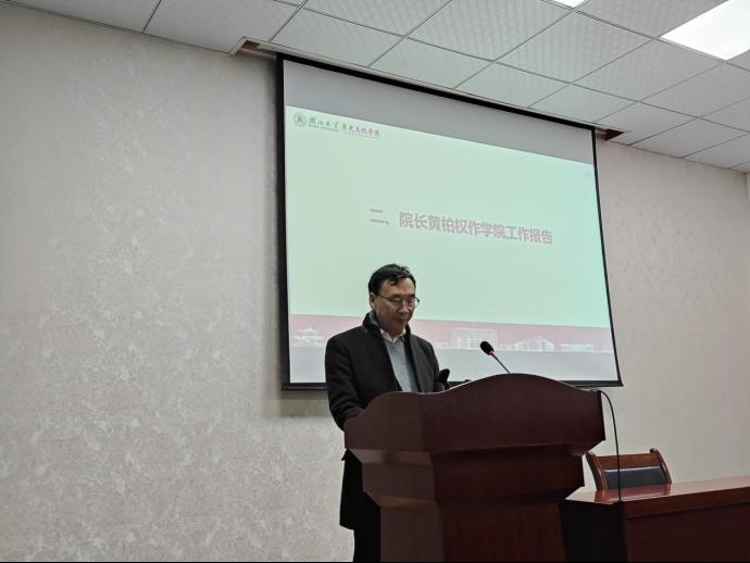 大会在雄壮的国歌声中拉开帷幕。院长黄柏权代表学院领导班子作学院工作报告。黄院长在报告中对我院五年来的工作情况进行了回顾,从学科建设、人才培养、科学研究、社会服务、党的建设五个方面总结了学院工作的成就,指出我院近年来事业发展成绩显著。对标一流学科建设指标体系和学院学科发展存在的短板与不足,就学院2024年的工作进行了全面部署和安排,并希望全院教职工共同努力,继续不断推进学院各项事业的发展,争取取得更大的突破。
