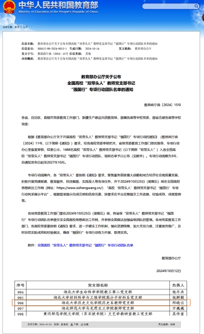 近日,教育部发布了《关于公布全国高校“双带头人”教师党支部书记“强国行”专项行动团队名单的通知》,英国365集团公司历史系教师党支部入选全国高校“双带头人”教师党支部书记“强国行”专项行动团队。