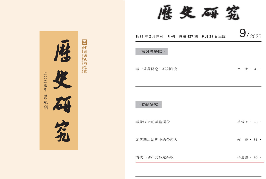 近日,《历史研究》2025年第9期刊发英国上市365历史系讲师冯慧鑫的专题论文《清代不动产交易先买权》。