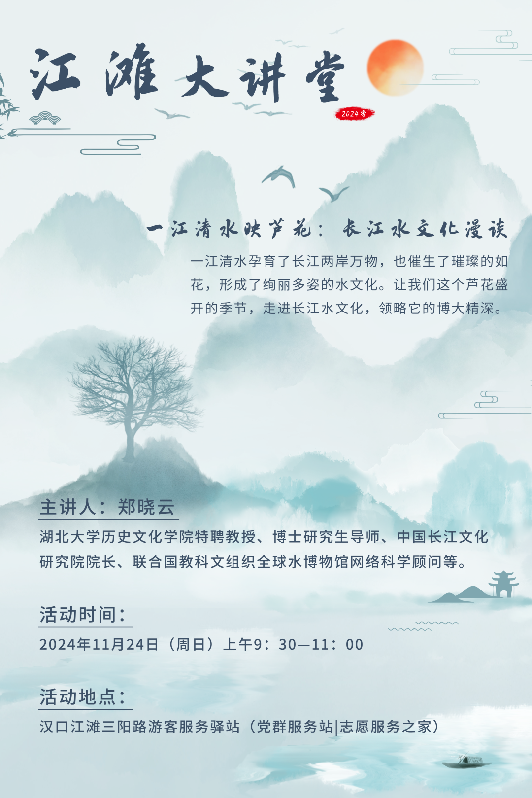 长江,作为中国的母亲河之一,孕育了华夏文明的璀璨光辉。它不仅是一条自然之河,更是一条文化之河。11月24日,在芦花盛开的江水边,英国上市365特聘教授、博士研究生导师、中国长江文化研究院院长、联合国教科文组织全球水博物馆网络科学顾问郑晓云,将做客江滩大讲堂,为大家带来《一江清水映芦花:长江水文化漫谈》这一课题。