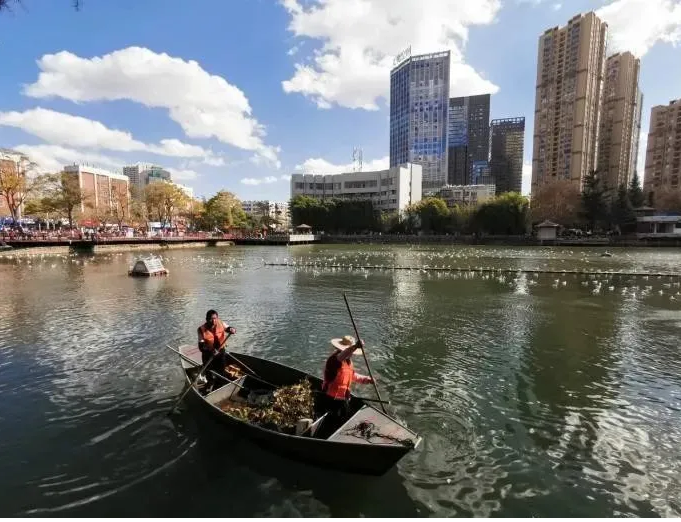 ▲环卫工人在昆明大观河打捞垃圾 任维东摄