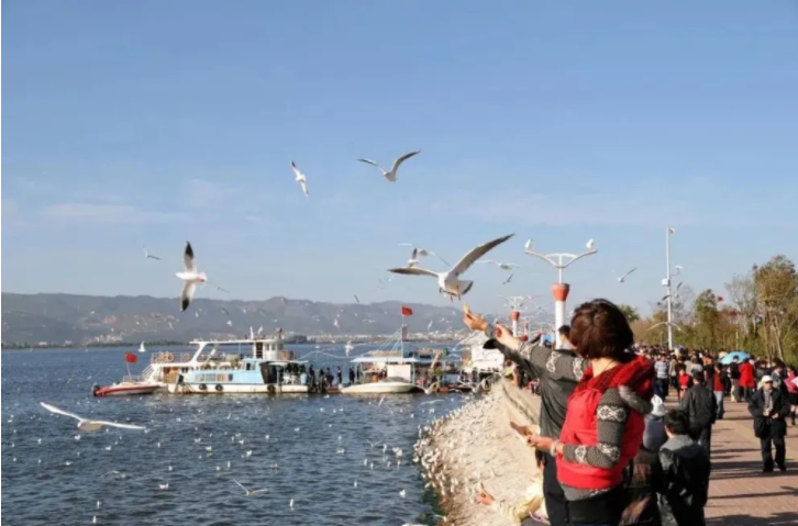 ▲市民与游客在滇池畔喂食越冬的红嘴鸥 任维东摄