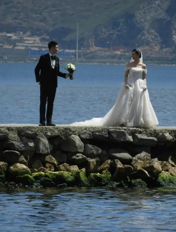 ▲一对情侣在洱海边拍摄婚纱 任维东摄