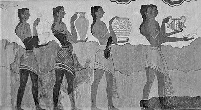 克里特岛科罗索斯皇宫遗址中手持水具的侍女壁画。资料图片