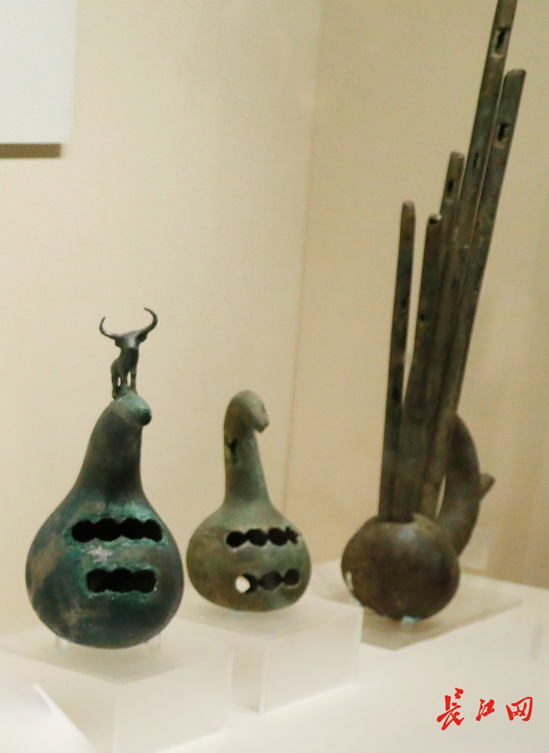 云南省博物馆副馆长、研究馆员樊海涛介绍,早在商周时期,我国古代乐器八音分类中就有用葫芦制作的匏类乐器——笙,西南少数民族使用的葫芦笙,由中原传入的笙改良而成。从湖北随县曾侯乙墓出土的几支战国初期的笙,充分证明了这一点,而在春秋晚期的湖北当阳曹家岗号楚墓出土的2件残笙斗是我国发现最早的葫芦笙实物。