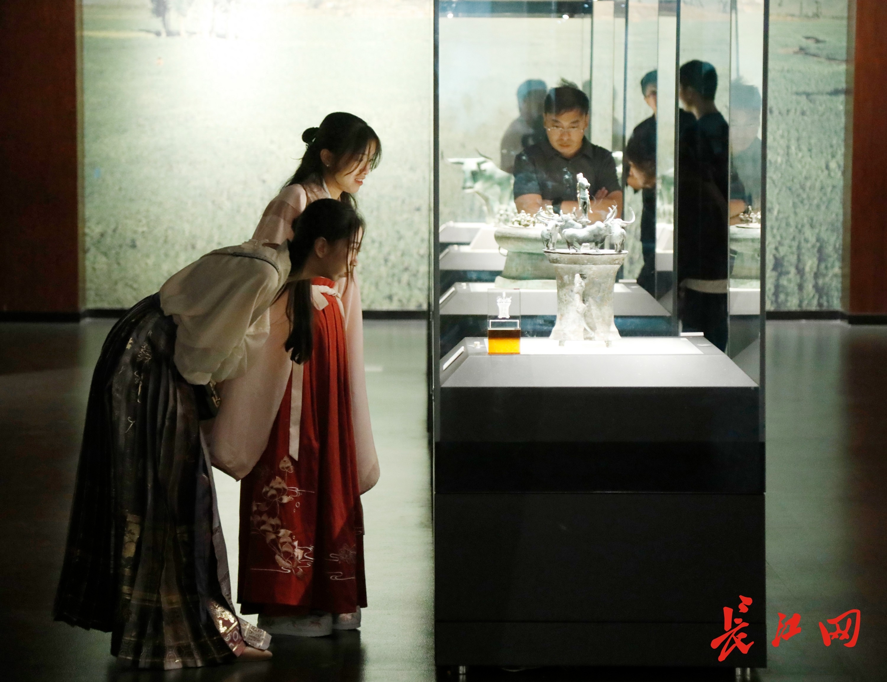 9月6日,身着汉服的青年游客在云南省博物馆内陈列有古滇国青铜器展台前,仔细观看文物。王筝 摄