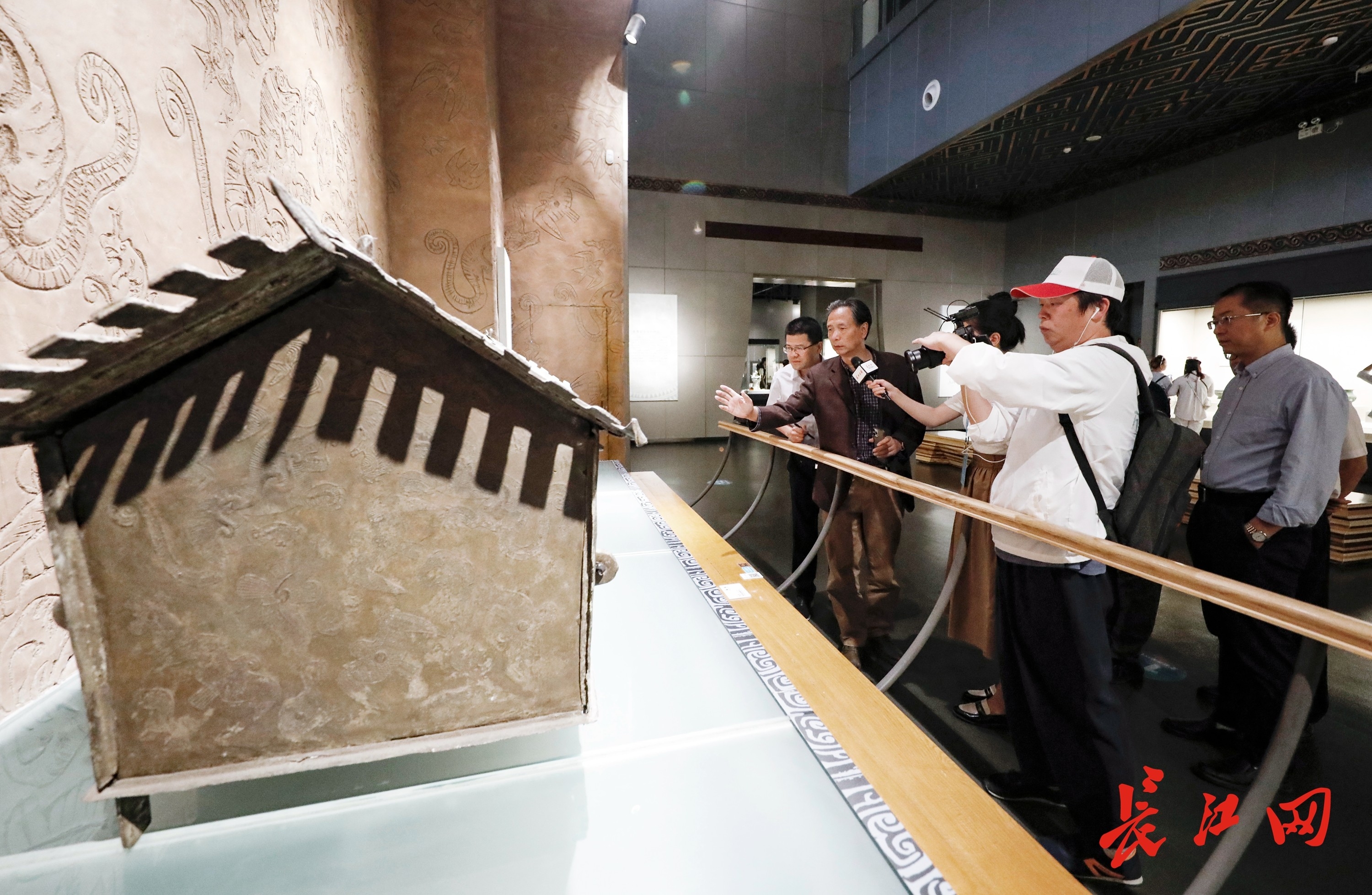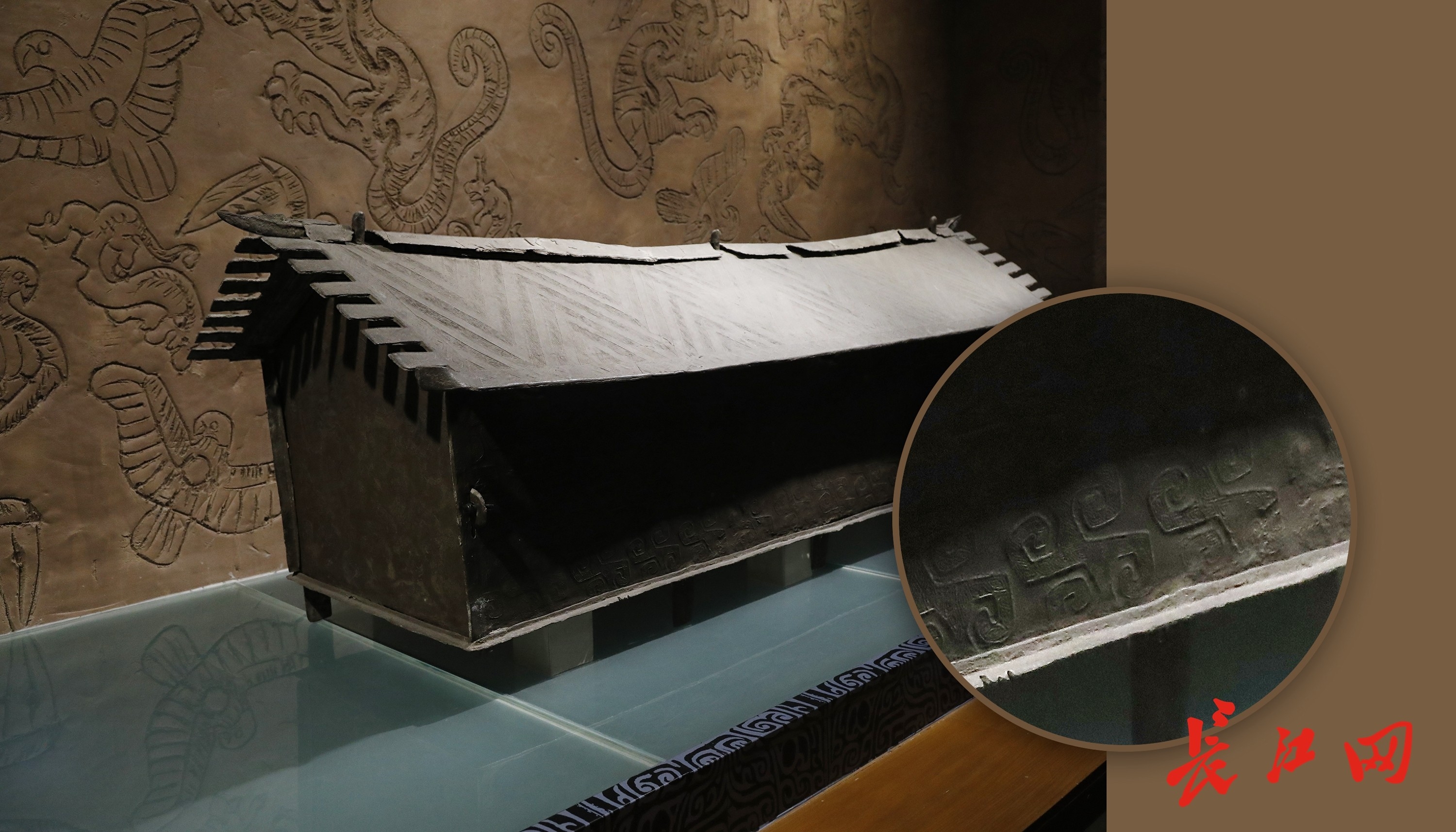 “祥云大波那铜棺是迄今在云南发现的最大青铜器,同时也是全国仅有的一具保存完整的青铜器时代铜棺。”云南省博物馆讲解员说。长江网记者观察到,铜棺底部由四根小铜柱托起,整体由七块铜板组成;铜棺两侧壁外表布满回纹与云雷纹图案,棺盖上布满连叠“人”字形带。