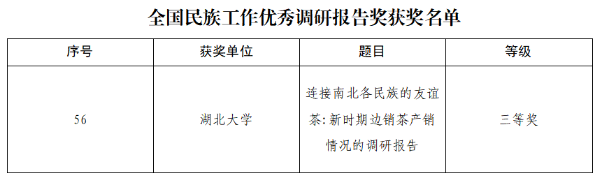 据悉,全国民族工作优秀调研报告奖是由国家民族事务委员会颁发的社会科学研究成果奖,是国家给予民族工作与民族问题研究成果的最高级别奖励。本次共评选出全国民族工作优秀调研报告260篇,其中一等奖25篇,二等奖50篇,三等奖80篇,优秀奖105篇。